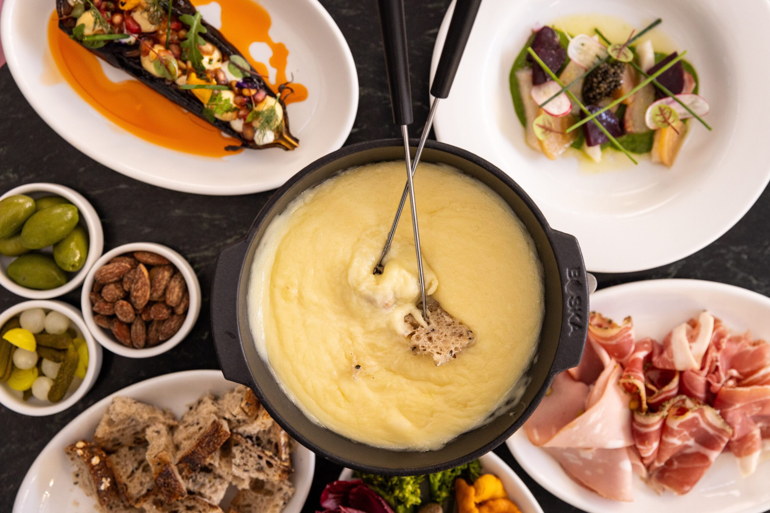 Wat staat er op het menu? Drie verschillende kaasfondues. Je kunt kiezen uit de smaken Truffel, Hollandse kaas en Zwitserse kaas. Hierbij krijg je lekker knapperig warm stokbrood en genoeg verschillende groenten om mee te dippen.